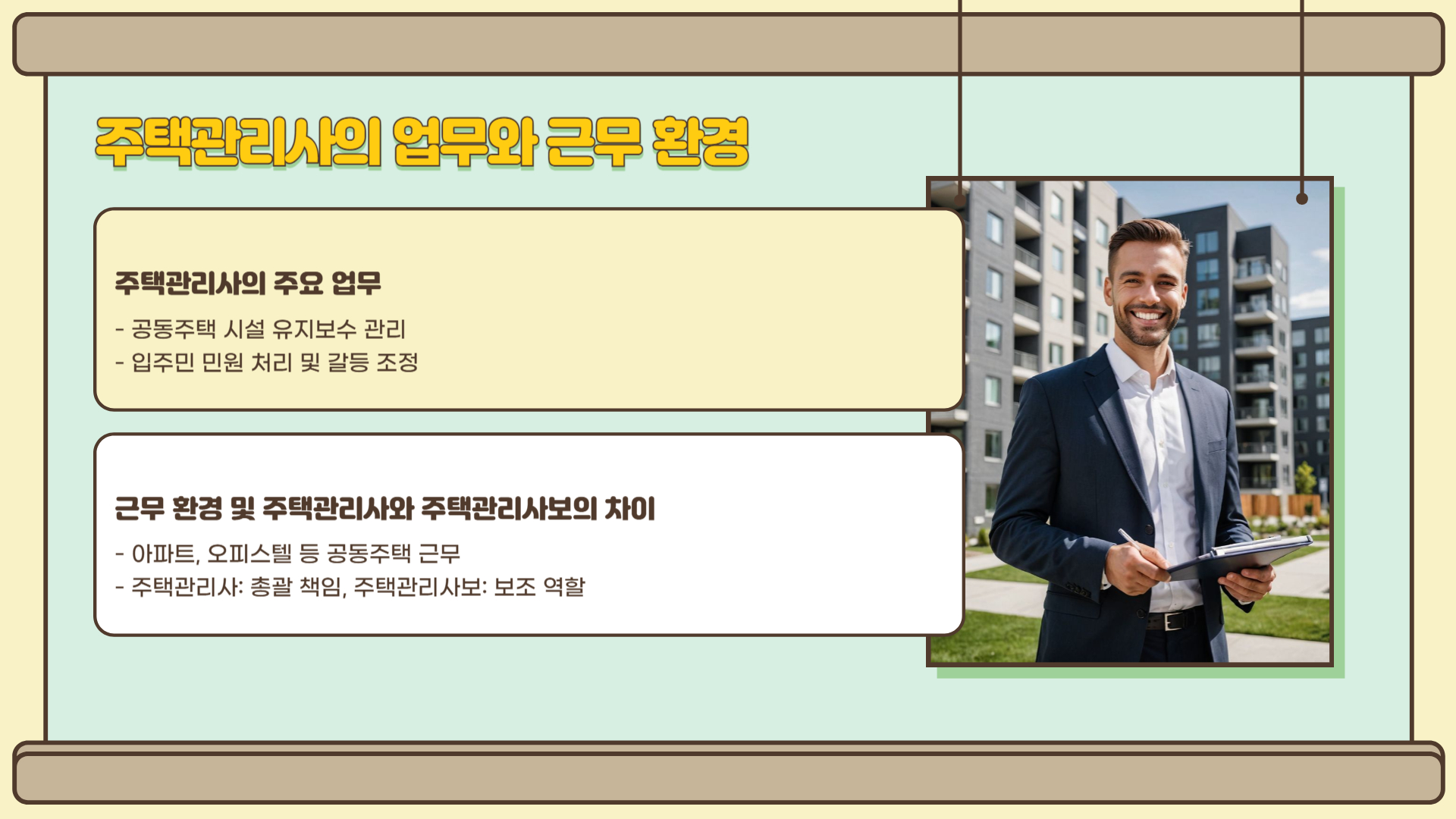 주택관리사는 ‘공동주택관리법’에 따라 일정 규모 이상의 공동주택 단지에서 필수로 선임되어야 하는 국가공인 자격입니다. 관리소장, 부소장 등의 직책으로 근무하며, 입주민 민원 관리, 시설 유지보수, 회계 관리, 용역업체 계약 등 아파트 운영의 실질적인 책임을 지는 역할입니다.