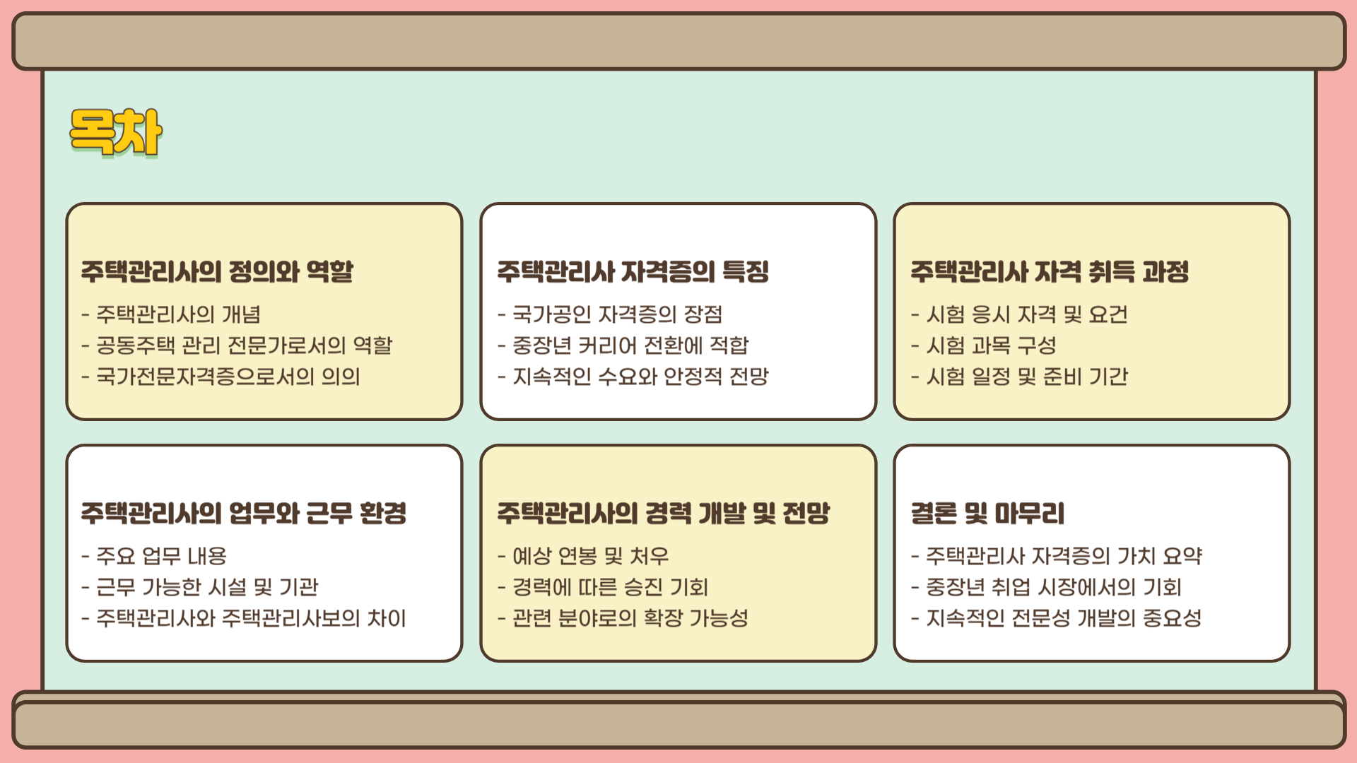 주택관리사는 전문성과 안정성을 동시에 갖춘 자격증으로, 중장년의 제2의 커리어, 공기업 전환, 안정적 수입 확보를 원하는 이들에게 매우 실용적인 선택지입니다. 준비 과정은 결코 쉽지 않지만, 수요가 분명한 시장에서 유효하게 쓰일 수 있는 만큼 체계적인 계획으로 도전해볼 만한 자격입니다.